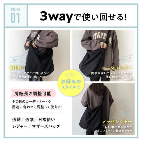 肩掛け、ショルダー、メッセンジャーのお好みのスタイルで使い回し可能♪