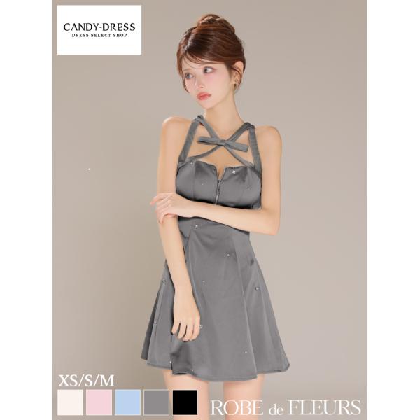 【ROBE de FLEURS / ローブドフルール】サテン/ ビジュー/ ネックリボン/ ジッパー/ 背中あき/ フレア/ ミニドレス/ キャバドレス / ワンピース/ ドレス[fm3597]