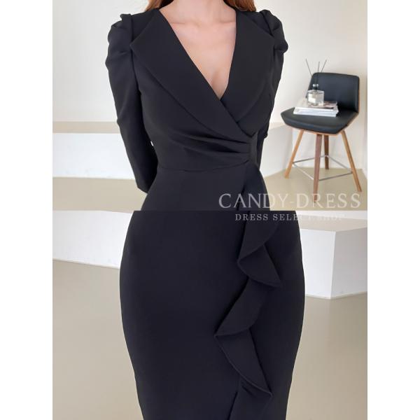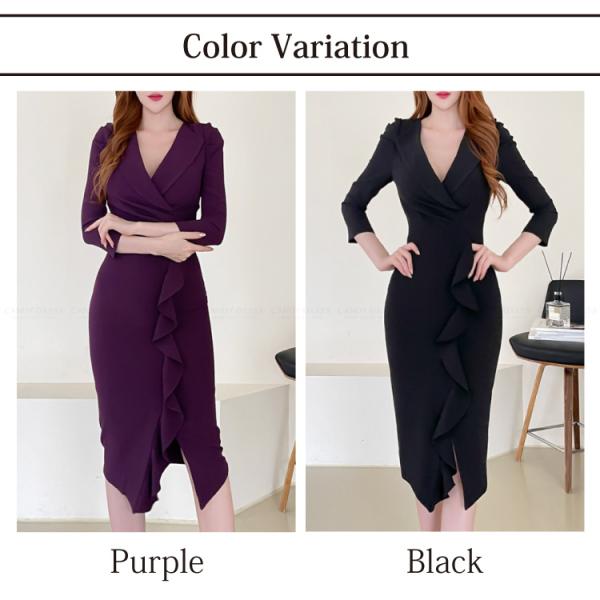 Luxury Dress ストレッチ無地×カシュクールフリルデザイン七分袖タイトミディドレス GA211007 韓国製 韓国ドレス 正規品 ワンピース 膝丈 結婚式