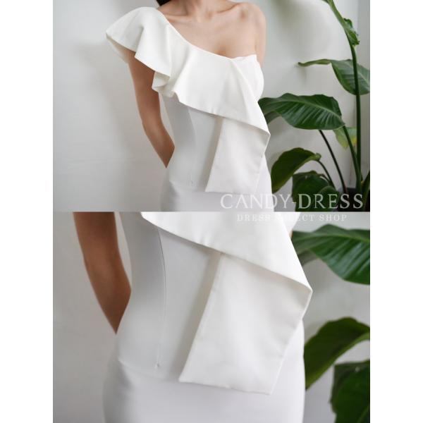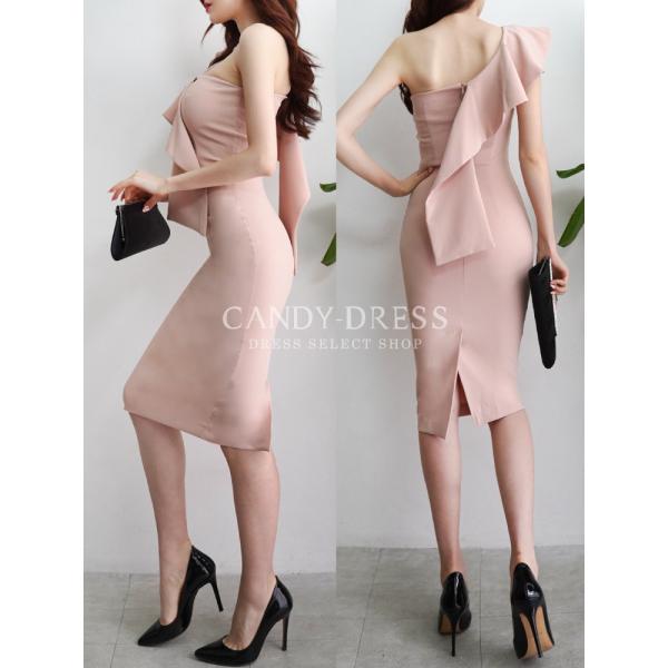 Luxury Dress ストレッチ無地×フリルワンショルダーシンプルタイトミディドレス TR200711 膝丈 ワンピース 韓国 カラードレス キャバドレス