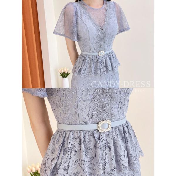 Luxury Dress 総フラワーレース×ペプラムデザインフレア半袖タイトミディドレス(ベルト付) TR210603 韓国製 正規品 膝丈 ミディ丈 ミモレ丈 ワンピース カラー