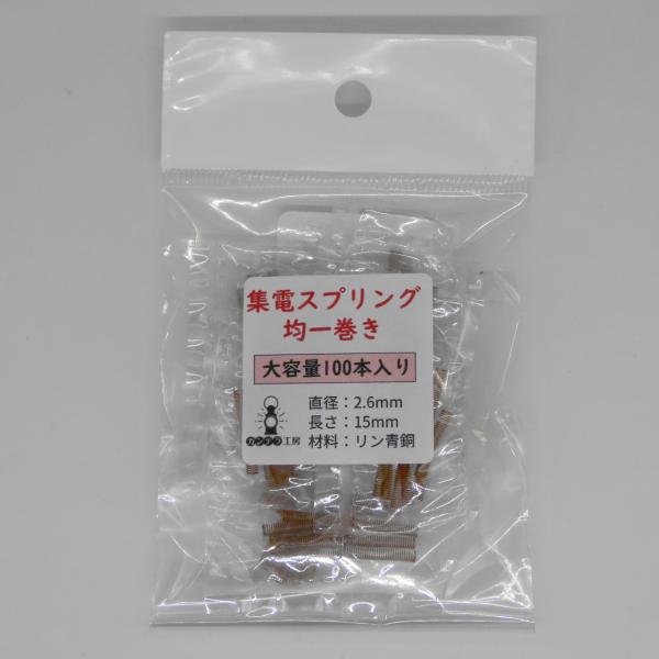 室内灯の集電用スプリングで、全体が均一巻きになっているタイプです。材料はリン青銅で、直径は約2.6mm、長さは約15mmです。50両分(100本)入りです。グランライトや自作室内灯にご利用頂けます。全体が端部が密巻きになっているタイプもございます。<内容量> 100本(50両分)
