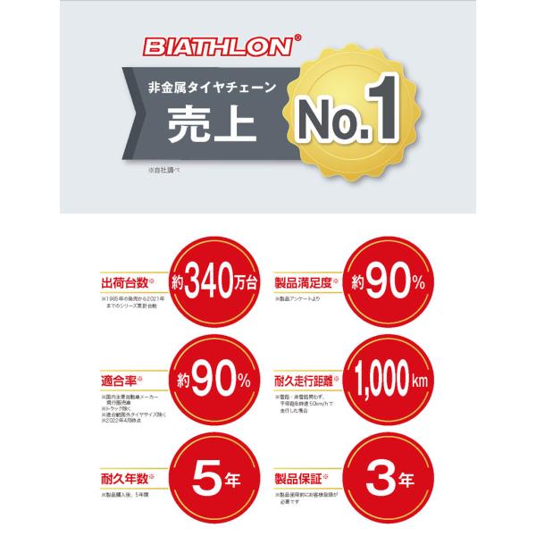 バイアスロンシリーズは、より素早い取り付けと、確実なアイスバーンへのグリップ性能で非金属チェーンの国内販売台数No,1 (当社調べ)の高性能非金属チェーンです。