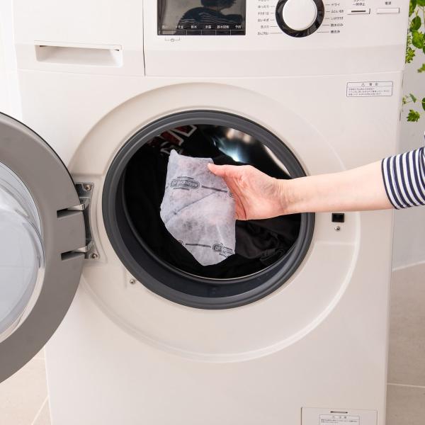 (2)洗濯機にシートを1〜3枚入れます。枚数が多いほど、色が濃くなり、毛羽たちがスムースになります。黒色を長持ちさせるために、定期的に1枚入れて洗濯してください。