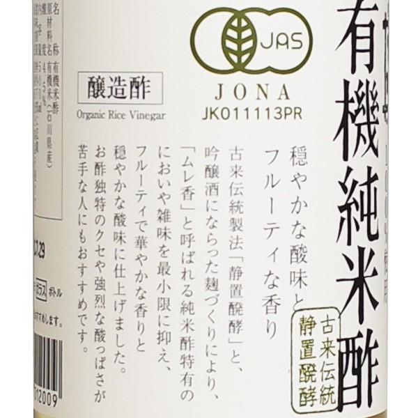 金沢大地の有機米を原料に、伝統製法により米酢だけを専門につくる福井県の蔵元「河原酢造」(こうばらすぞう)(有機JAS認定工場)がつくる有機米酢です。吟醸酢にならった麹づくりと、じっくりと時間をかけてつくる伝統的な「静置醗酵」とよばれる製造法により、強烈な酸っぱさのないやさしい酸味に仕上がります。