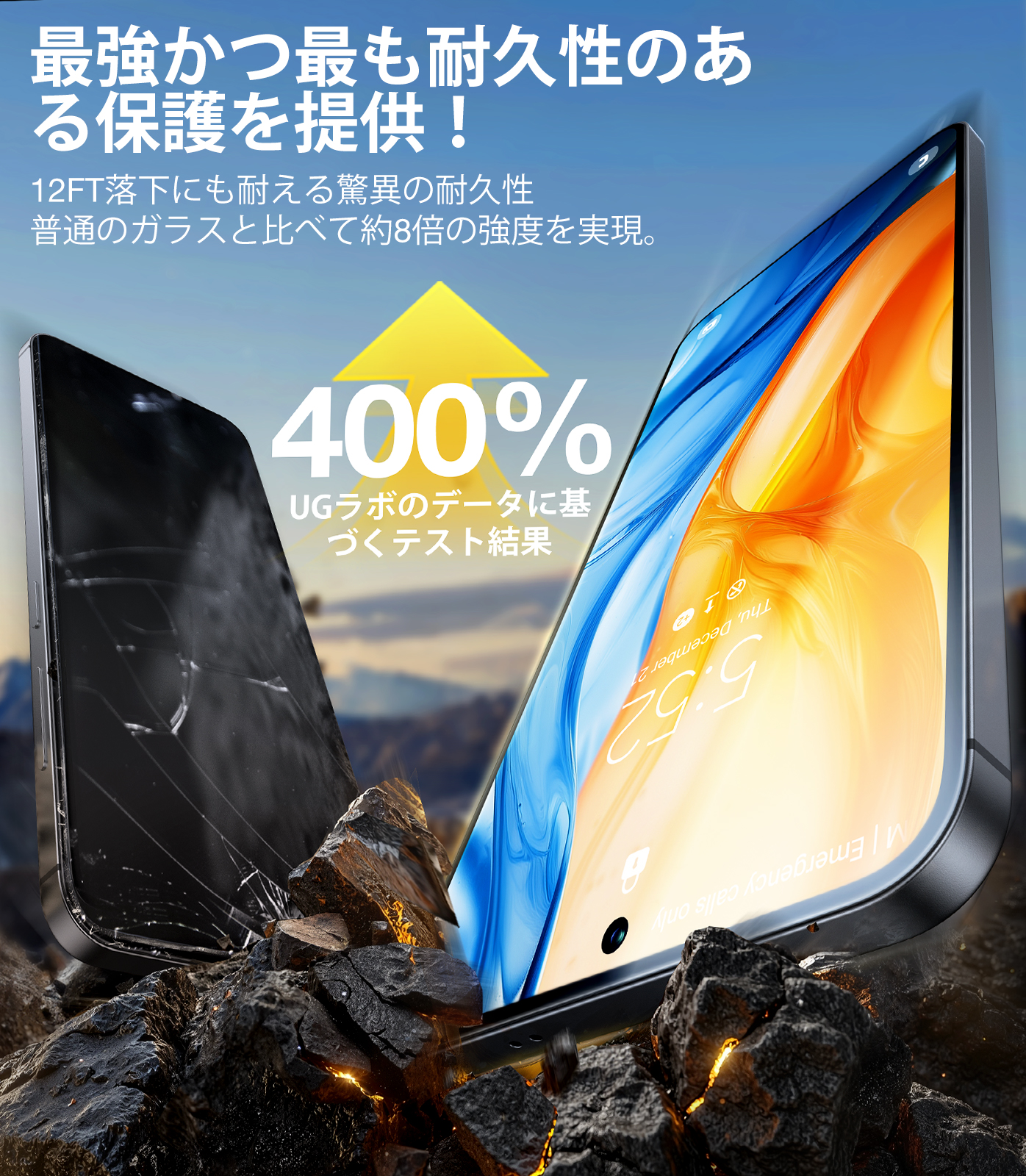 ・9H+の高い硬度により、傷や衝撃から画面をしっかり保護。長期間使用しても美しさをキープ。