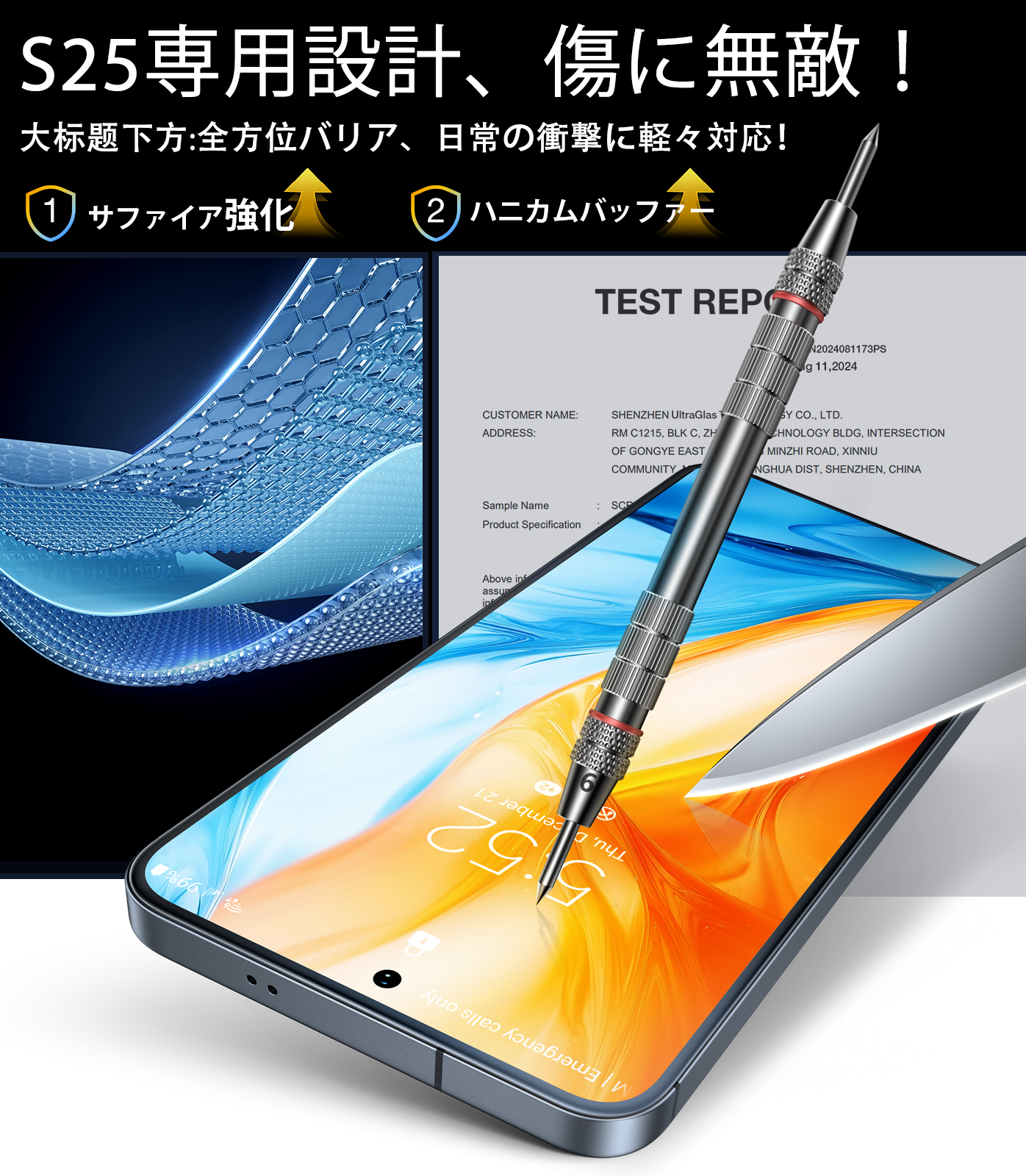 ・S24モデルと比較して全面クリアデザインを採用、黒縁なしの完全透明フィルムで、視界を妨げずクリアな画質を提供。虹模様の発生を防止します。