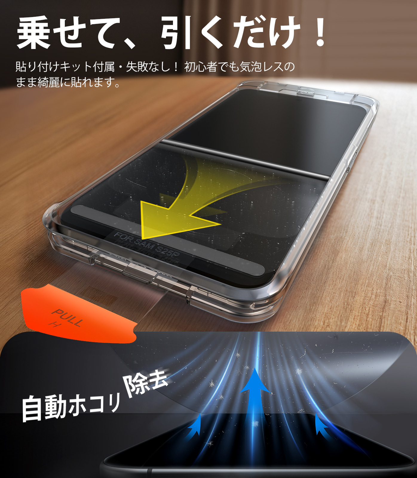 ・静電気除塵技術を採用し、静電気の力でホコリを取り除き、簡単に綺麗な貼り付けが可能。