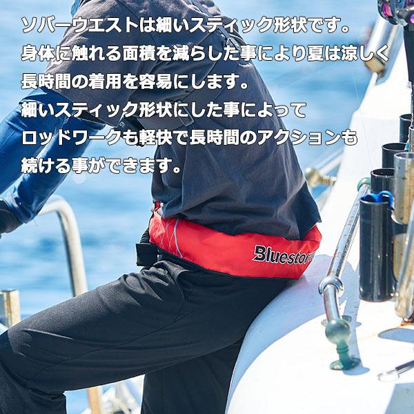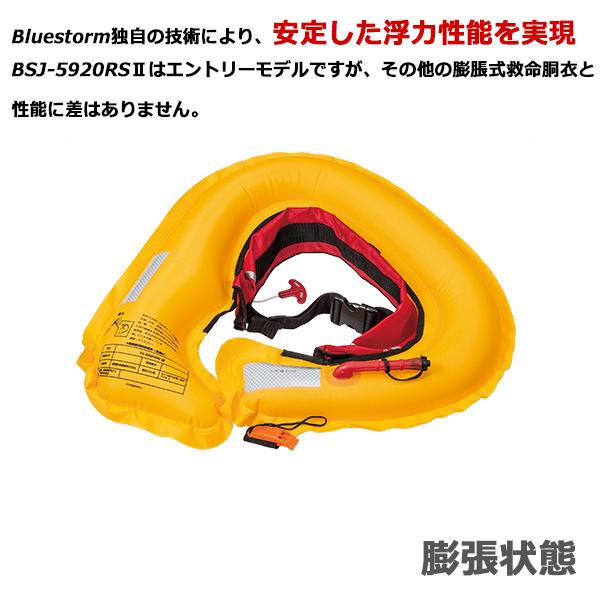 BSJ−5920RS2はエントリーモデル・ウエストタイプの膨脹式ライフジャケットです。Bluestormウエストシリーズの中でも最も細い形状です。体に触れる面積を減らした事により、夏は涼しく長時間の着用を容易にします。また、ロッドワークも快適で長時間のアクションも続けることができます。国土交通省型式承認Type Aを取得しています。