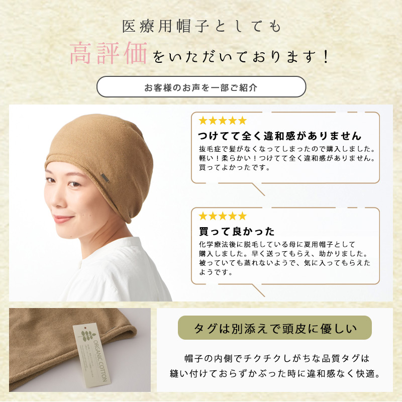 オールシーズン対応のこの帽子は、春夏の涼しい日から、室内でのリラックスタイム、さらには就寝時や医療用としても最適です。