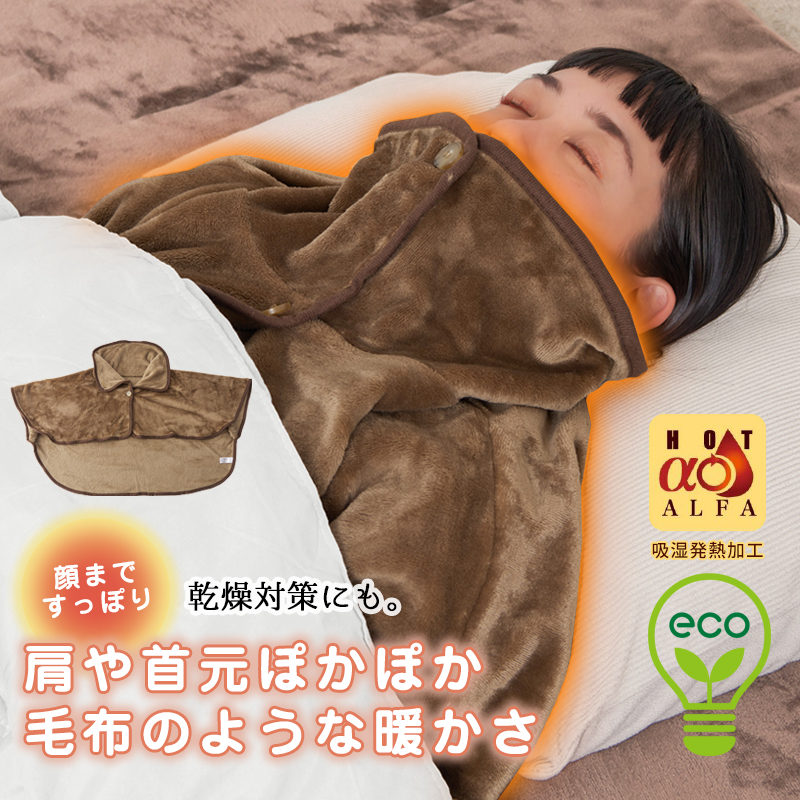肩までしっかり覆って、冷えやすい肩や首元を包み込み、ボタンをとめれば、鼻までカバーできるので乾燥対策にも。