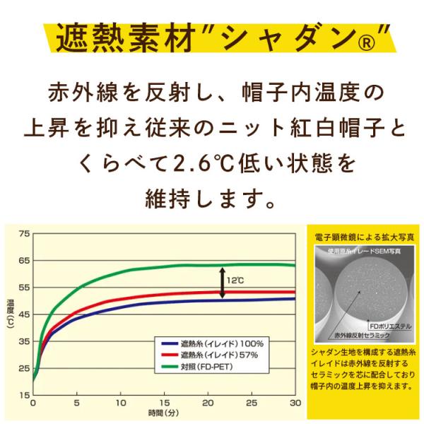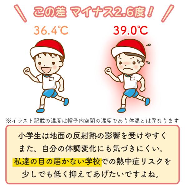 遮熱効果で一般的な赤白帽子と比べ【マイナス2.6℃】帽子内の温度上昇を抑えます。