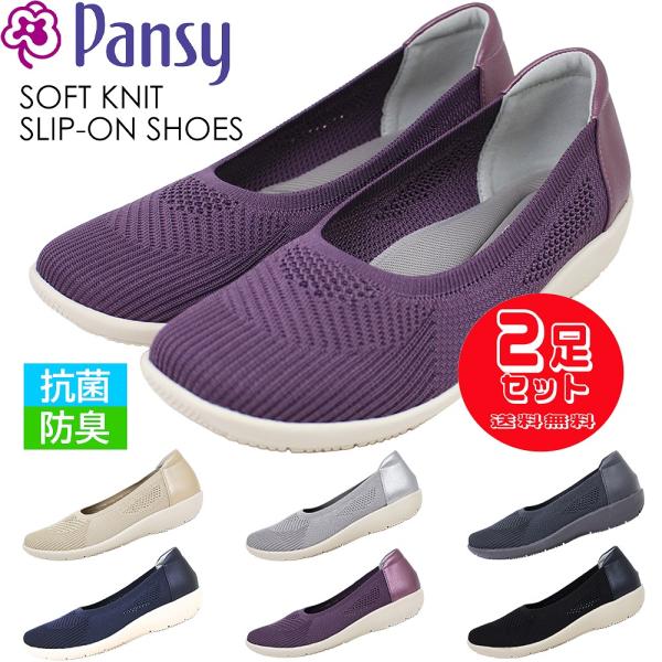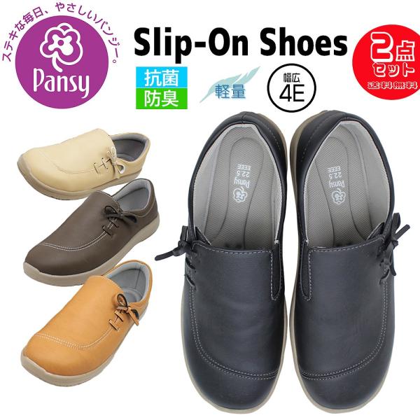2足で5918円 パンジー レディース スリッポン 幅広 4E カジュアルシューズ 抗菌 軽量 サイドゴム 履きやすい 柔らか リボンモチーフ シューズ ブラック Pancy