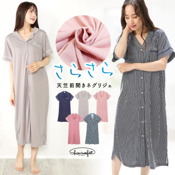 ネグリジェ 前開き レディース 半袖 パジャマ ワンピース ロング丈 可愛い ルームウェア 天竺ニット 無地 入院 産前 産後 マタニティ w1-77311 圧縮