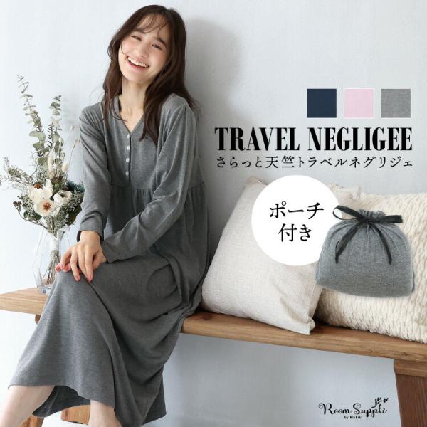トラベルパジャマ ポーチ付き 長袖 ネグリジェ ワンピース 天竺素材 レディース 春 秋 巾着袋付き マタニティ 授乳 収納 旅行用 お泊り 海外旅行 w3-904101 圧縮