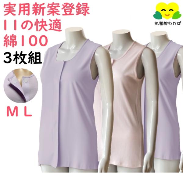 3枚組 送料無料 介護肌着 前開き 肌着 女性 袖なし M L 下着 レディース マジックテープ シャツ 抗菌 消臭 加工 介護 婦人 着脱らくらく ピンク パープル