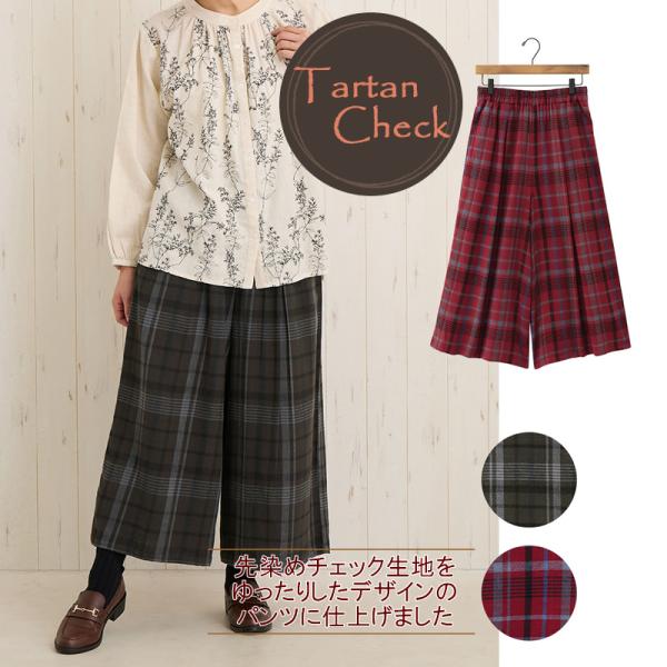 パンツ タータンチェック レディース ロング セミロング ワイドパンツ キュロットパンツ ズボン 綿 アジアン エスニック エキゾチック チャコール レッド