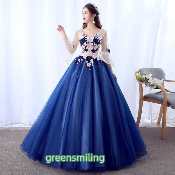 カラードレス ロングドレス 演奏会 イブニングドレス プリンセスライン ステージ 舞台衣装 発表会 コンサート コンクール 大人 青 ブルー ネイビー 袖付き 花