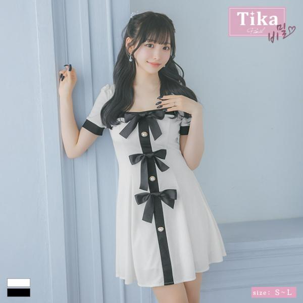 [TikaPimil] キャバ ドレス 半袖 スクエアネック パイピングサテン リボン モノトーン フレア ミニドレス