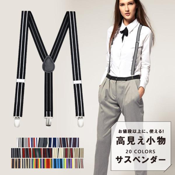 サスペンダー レディース メンズ 男女兼用 吊りバンド ファッション小物 3点留め 長さ100cm 幅2.5cm 赤 黒 白 青 紫 ピンク 茶 グレ