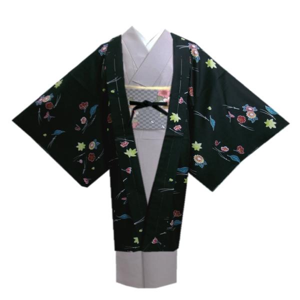長羽織 はおり コート 洗える 黒地桜楓野菊松葉 フリー 羽織紐付 ロング丈 単品 和装 着物 女性用 黒色