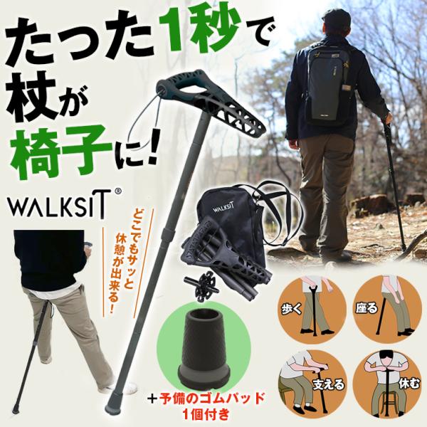 WALKSIT +予備のゴムパッド1個付き ウォーキングステッキ 椅子になる杖 座れる杖 チェア一体型 杖 一本杖 一脚杖 スツール 椅子 イス トレッキングポール