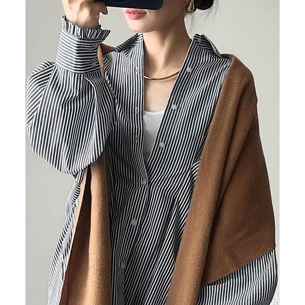 ブラウス シャツ 甘さ控えめの好バランスウエストタック袖フリルビッグ長袖シャツ(無地・チェック柄・ストライプ柄アソート) レディース
