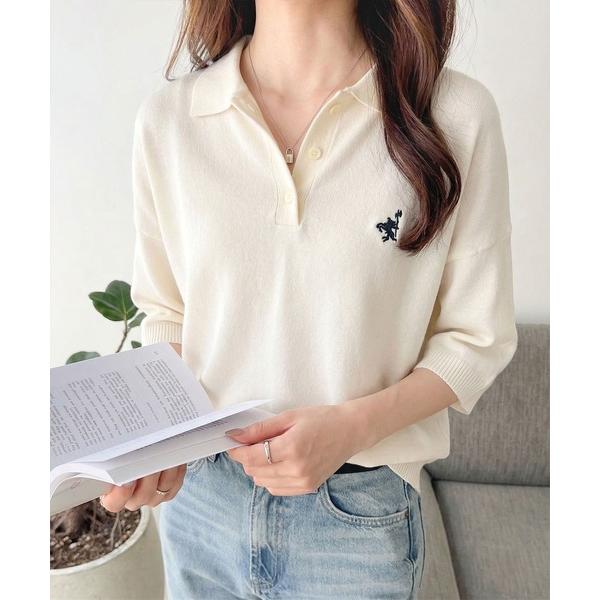 ポロシャツ ポロ 抜け感のあるゆったりシルエット。胸刺繍で上品さをプラス♪胸刺繍ルーズポロニットプルオーバー(半袖) レディース