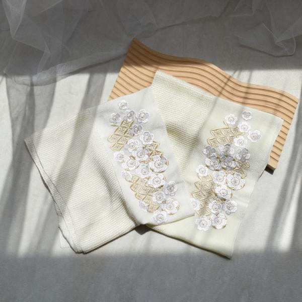 帯揚げ 振袖 成人式 花 白 ホワイト きなり オフホワイト 疋田刺繍帯揚 縮緬 ちりめん 刺繍 七宝 八重桜柄 シルク 正絹 上品 ワントーン 和装 結婚式