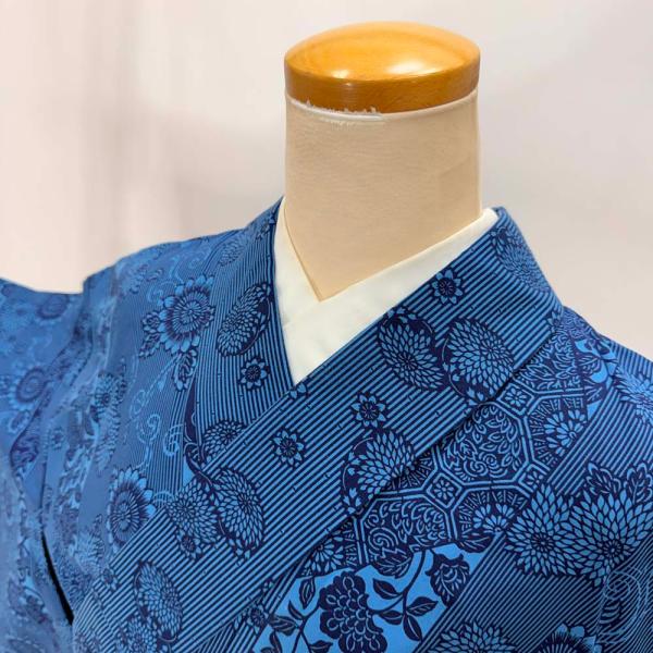 小紋 単衣 洗える着物 裄63.8cm 身丈155cm 青色 お洒落着 普段着 ポリエステル 美品 S サイズ 5329