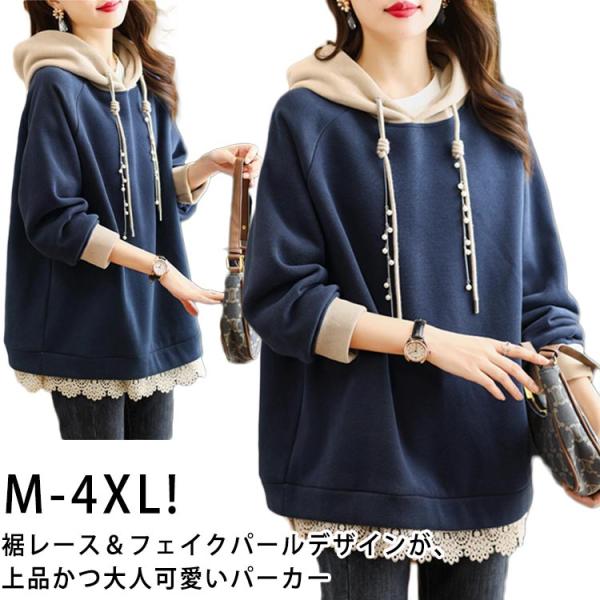 フード付き 裏起毛 プルオーバー レディース 重ね着風 ゆったり スウェットパーカー 可愛い トレーナー フード付き パーカー カジュアル 大人 カジュアル レース