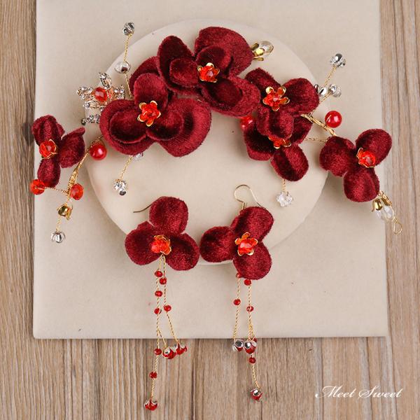ウェディングヘッドドレス 2点セット 髪飾り イヤリング フラワー レッド 赤 結婚式 二次会 発表会 演奏会 披露宴 前撮り ブライダル パーティー 花嫁小物