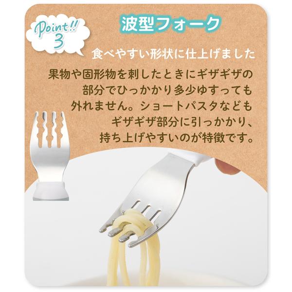 フォークは、なみなみ形状で、食事が掴みやすい設計です。