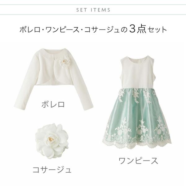 女の子の入学式や卒園式、晴れの日コーデを彩るボレロ、ワンピース、コサージュのスーツ3点セット。