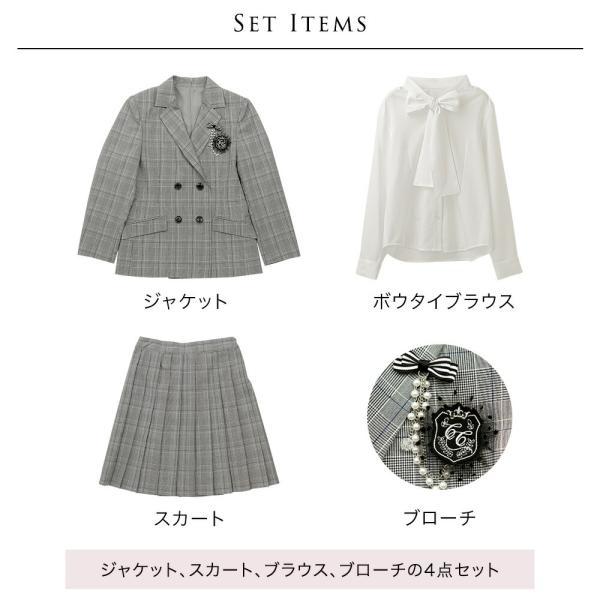 【セット内容】ジャケット、スカート、ボウタイブラウス、ブローチ