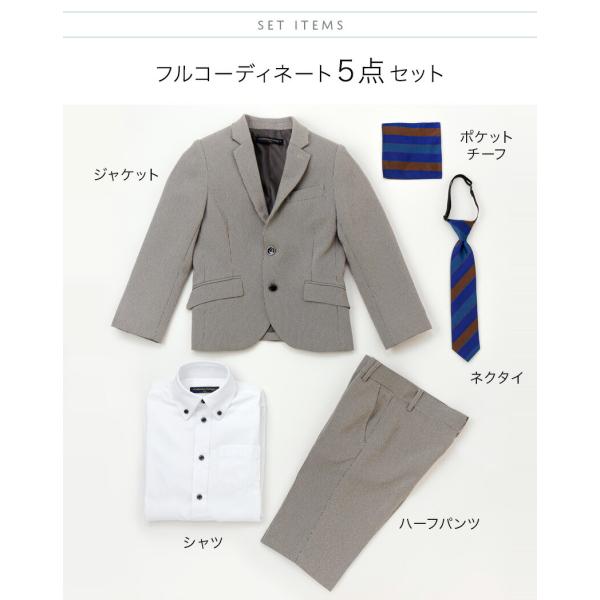 [100cm 110cm 120cm 130cm 男の子キッズスーツ5点セット 入学式 卒園式 結婚式 七五三 発表会 フォーマル ジャケット ハーフパンツ Yシャツ ネクタイ ポケットチーフ ベージュ グレー おしゃれ 上品 オールシーズン キャサリンコテージ 子供服 冠婚葬祭]