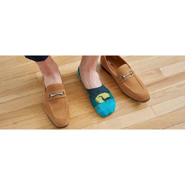 特徴的なポップな柄だけど、革靴やスニーカー、スリッポンなどまるで素足そのままに靴を履いているように周りからは見えます。