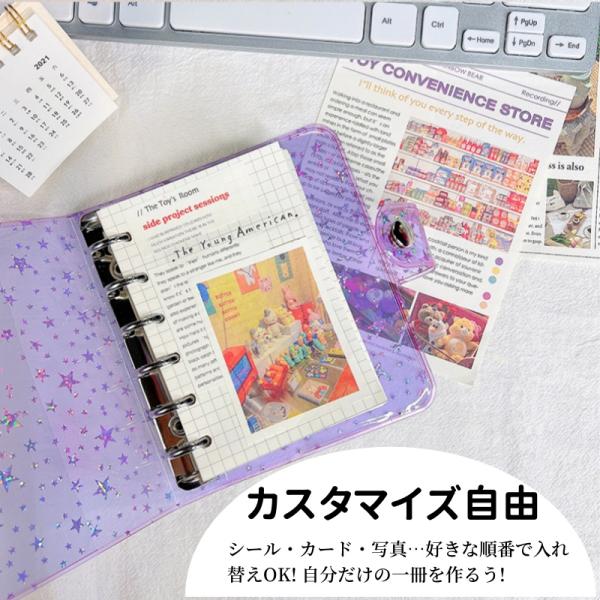 キラキラ輝くシール帳カバーA7 シール収納 リフィル10枚付き クリア手帳 透明バインダー 6穴リング カスタマイズ手帳 DIYデコ ミニ手帳 ホログラム星柄
