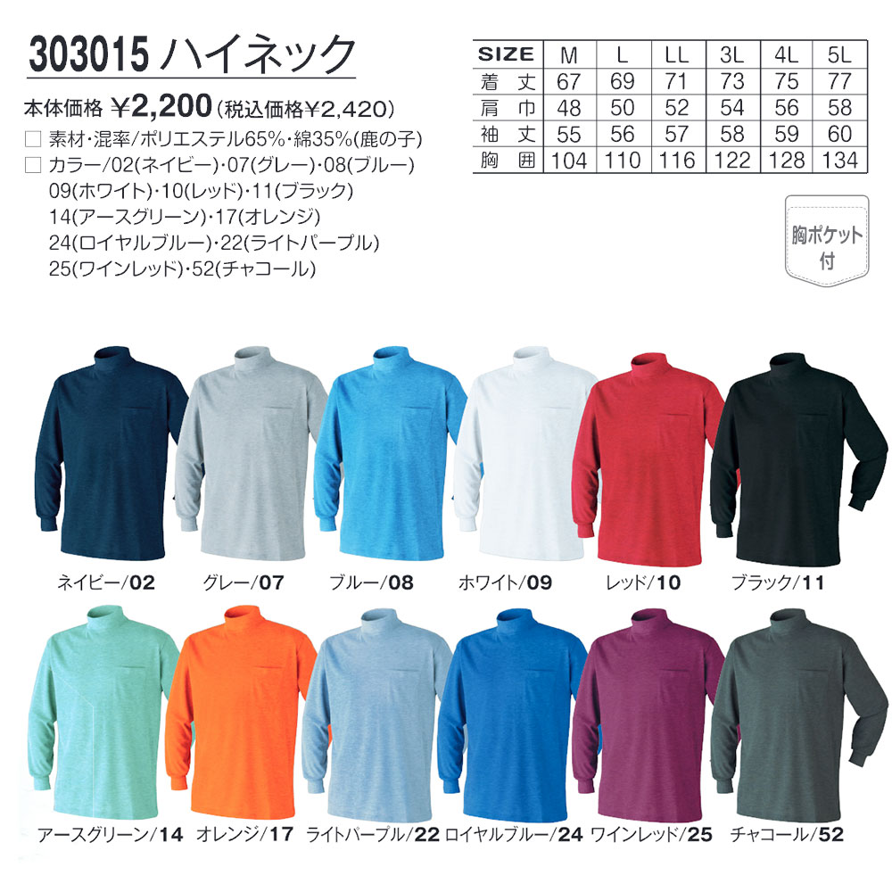 アタックベース 作業服 シャツ メンズ 長袖 インナー ハイネック ローネック アンダーシャツ トップス 春 夏 秋 冬 作業着 大きいサイズ 胸ポケット 303015 爆買
