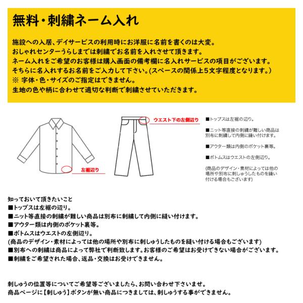 介護施設、デイサービス等でお名前の記入が必要な方には無料で刺しゅう名入れをしております。(刺しゅうの入れられない商品もございます。)