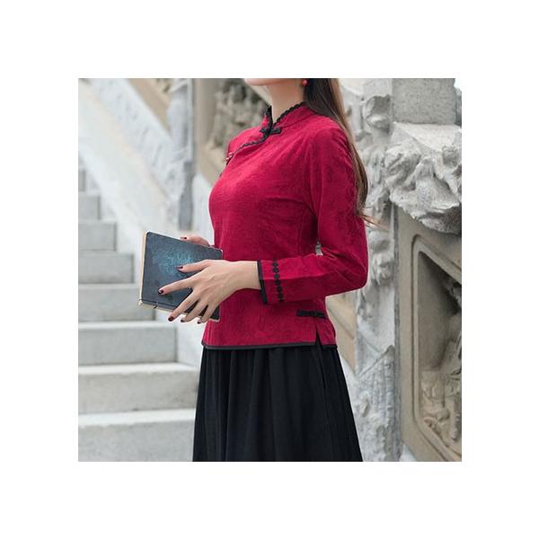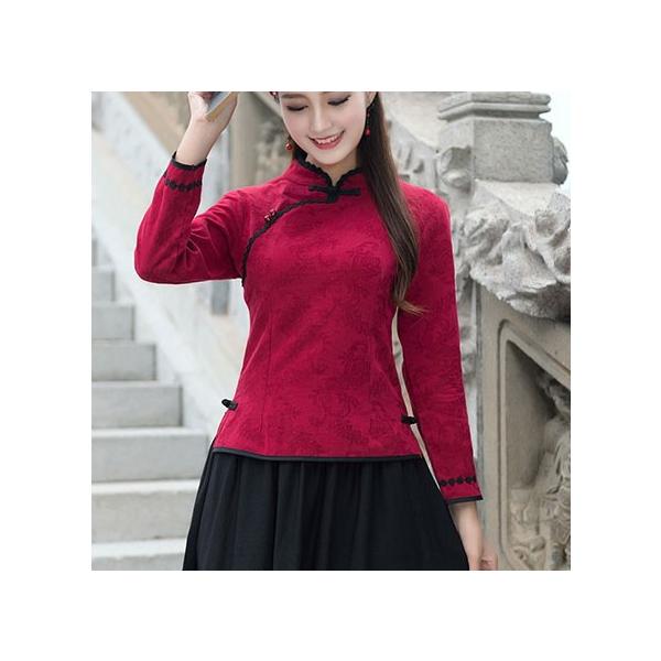 チャイナ服 長袖トップス ★chaiは最大ポイント3倍★ 二胡衣装 刺繍 前開き 九分袖 赤 チャイナボタン 普段着 民族衣装 zt595