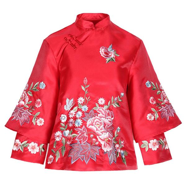 チャイナ服 長袖トップス ★chaiは最大ポイント3倍★ 二胡衣装 刺繍 前開き 九分袖 赤 チャイナボタン 普段着 民族衣装 zt595