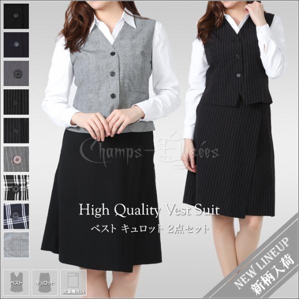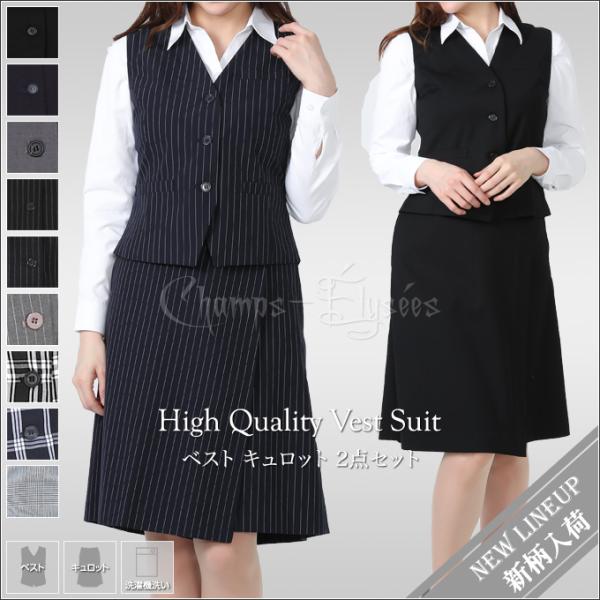 事務服 セット ベスト キュロット ベストスーツ 上下セット 無地 ストライプ チェック柄 TR素材 洗濯機で洗える 形態安定 UVカット 消臭 抗菌 機能性 撥水加工