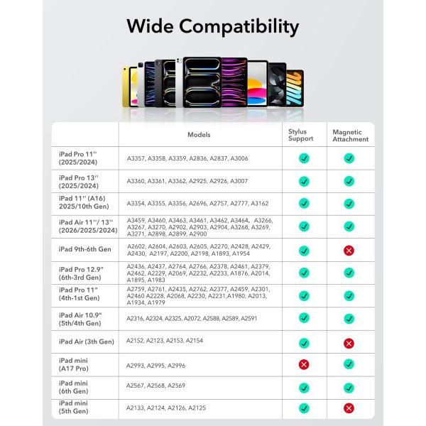 【対応機種】 iOS 12.2以上を搭載した2018年以降に発売されたiPadに対応、NEW 2026 iPad Air 11インチ&13インチ(M4/M3/M2)、2025 iPad 11世代(A16)&iPad 10世代、iPad Pro 11インチ&13インチ(M5/M4)、iPad 9/8/7/6世代、iPad Air 11/13(M3/M2)、iPad Air 3/4/5世代、iPad Pro 11インチ 1/2/3/4世代、iPad Pro 12.9インチ 3/4/5/6世代、iPad Mini 5/6世代; 他のiPadモデル、iPhone、Android、Microsoft、またはその他のデバイスとは互換性がありません。