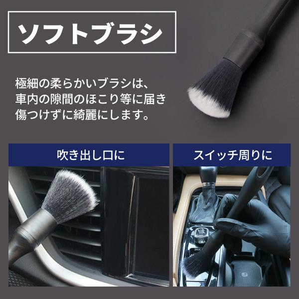【ソフトブラシ小】:とても柔らかいブラシで、主にエアコンの出口、ハンドルの隙間、シートの隙間、革の表面などに使用できます。