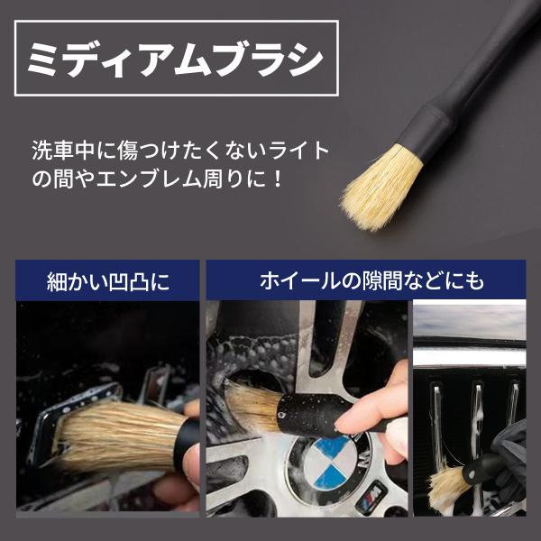 【ミディアム】: コシが必要な場所には豚毛ブラシ。主に車のロゴ、車のグリル、ヘッドライトの隙間、車体の隙間などのやや硬い部分の清掃に使用いただけます。