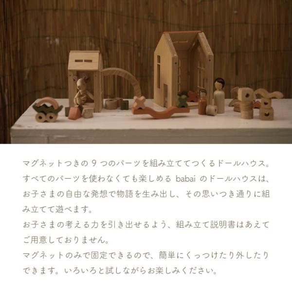 すべてのパーツを使わなくても楽しめるbabaiのドールハウスは、お子さまの自由な発想で物語を生み出し、それに従って組み立てて遊べます。
