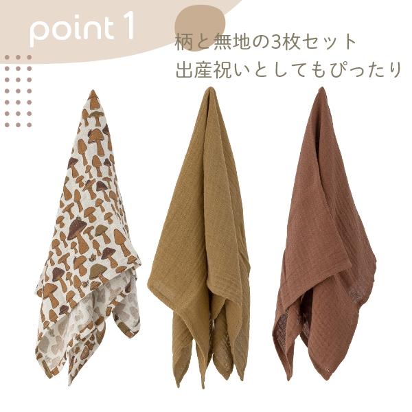「Marthe Baby Muslin」柄と無地の愛らしいハンカチ3枚セット。