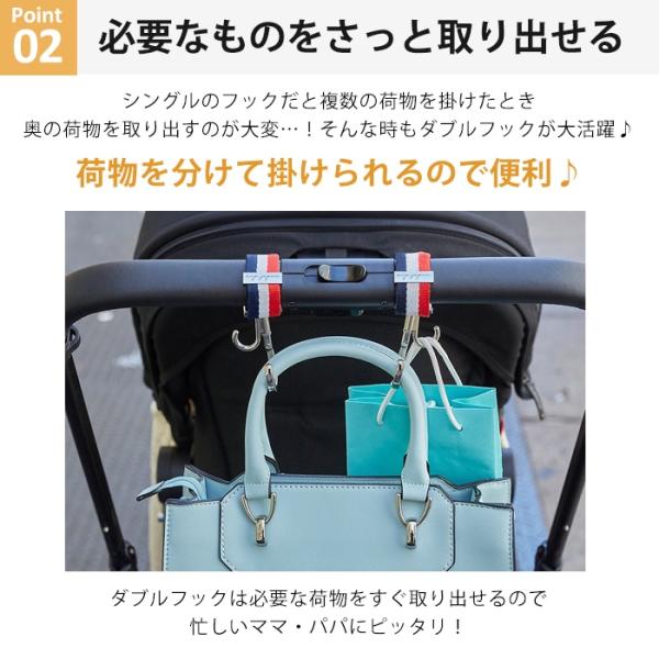 360°回転するのでどの向きからも荷物がかけられ、ちょっとした買い物袋などもかけられるダブルフック仕様。