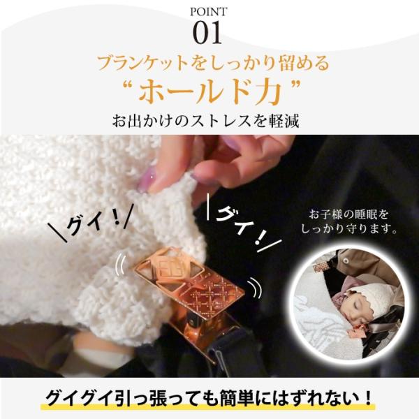 ベビーカーに取り付けて、ブランケットやタオルケットのずり落ちを防止します。